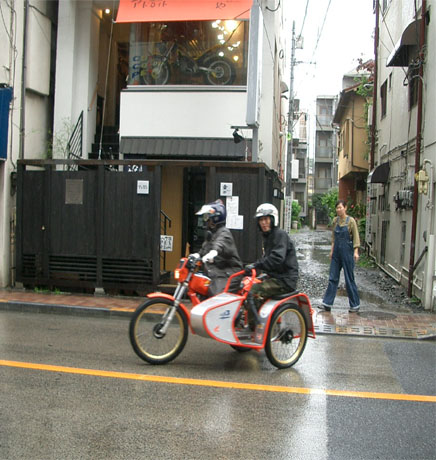 「大将が、サイドカーに乗ってモペットを取りに行くところ」